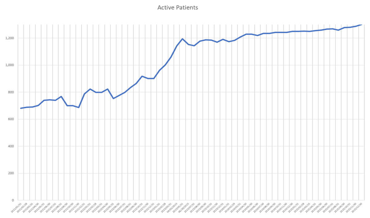 The number of patients on the program per month has increased steadily from 400 in 2020 to over 1,200 in 2025